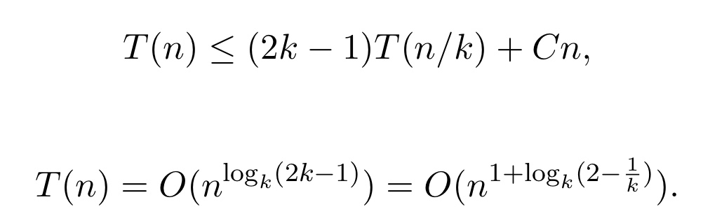 카라츠바 방법은 1960년 대에 나온 divde and conquer 알고리즘이다. 그 후에 이 방법을 좀 더 일반화시킬 수 있었다. U와 V를 k 파트들로 쪼개는 방식이다. 이렇게 쪼개게 되면, 총 2k-1번의 재귀콜이 생기게 되고, 카라츠바 방식과 동일하게 시간 복잡도를 구할 수 있게 된다.