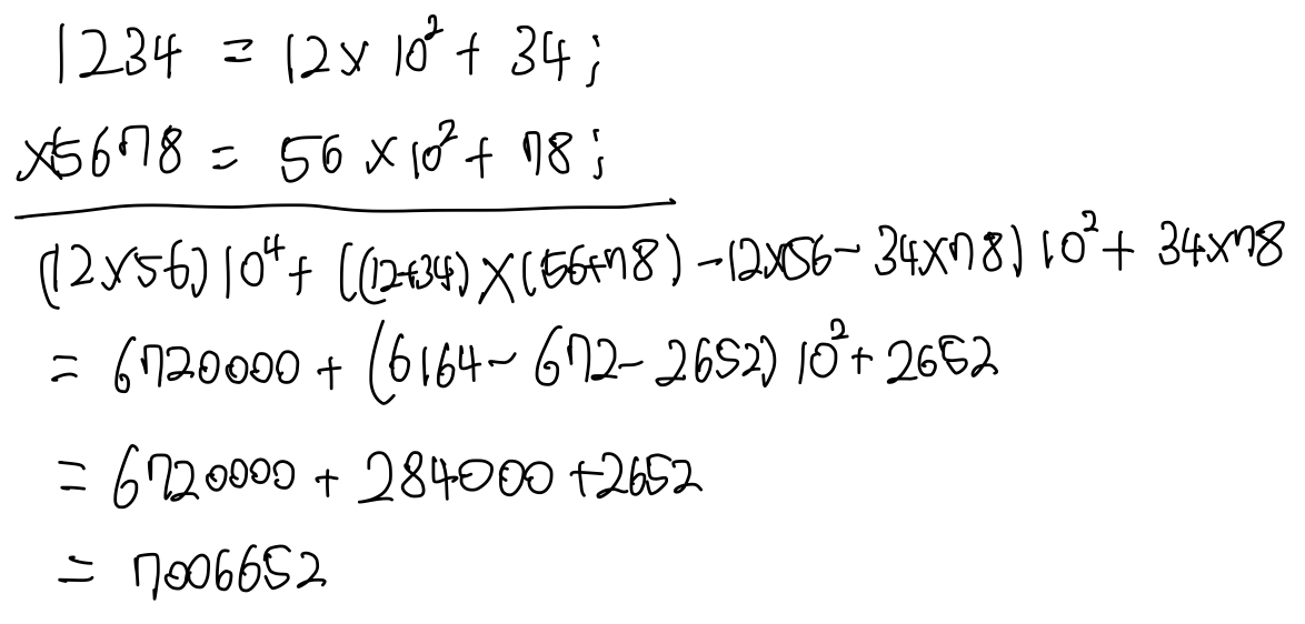 위와 같이 정리하게 된다면, (U0+U1)(V0+V1)에 대한 곱셈만 한 번 더 진행되고, U0V0, U1V1은 앞선 UV에서 이미 구한 값이므로, 전체적인 UV 값을 구하기 위해서는 총 3번의 곱셈이 나타난 것을 알 수 있다. 이제 1234 * 5678을 카라츠바 방법으로 진행해보겠다.