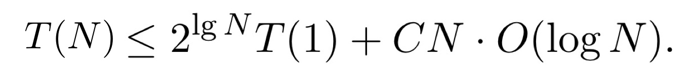 즉, N/2개의 배열로 나누고, 배열을 합치는 시간 N이 걸리는 것을 표현한 것이다. 똑같이, 2T(N/2)=4T(N/4)+CN으로 표현할 수 있고 T(N)을 T(1)에 대한 식으로 표현하면 다음과 같다.