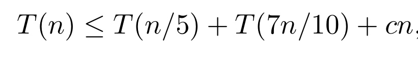 그럼 이 DSelect의 시간 복잡도를 알아보자. DSelect의 실행 시간을 T(n)이라고 하면 T(n)은 다음과 같이 표현할 수 있다.