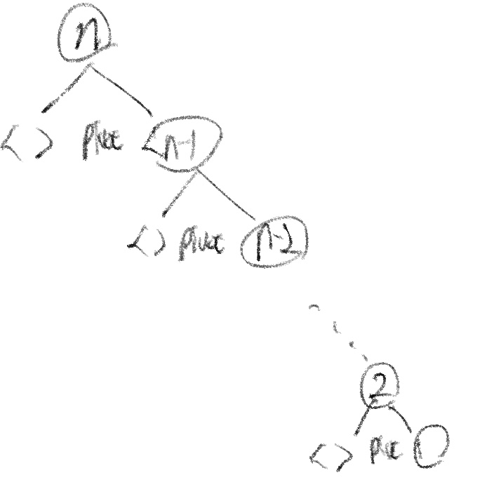 증명이 아닌 간단하게 설명만 하고 넘어가자면, 최악의 경우의 수가 나올 때는 N개의 key값이 트리에서 한 쪽 방향으로만 뻗어가는 경우이다. 트리를 생각하면 N개의 key 값은 갈 수 있는 경우는 left-subtree 쪽이거나 right-subtree쪽이다. N개의 input이 한쪽으로 치우치는 경우의 수는 2^n이 되는 것이다.