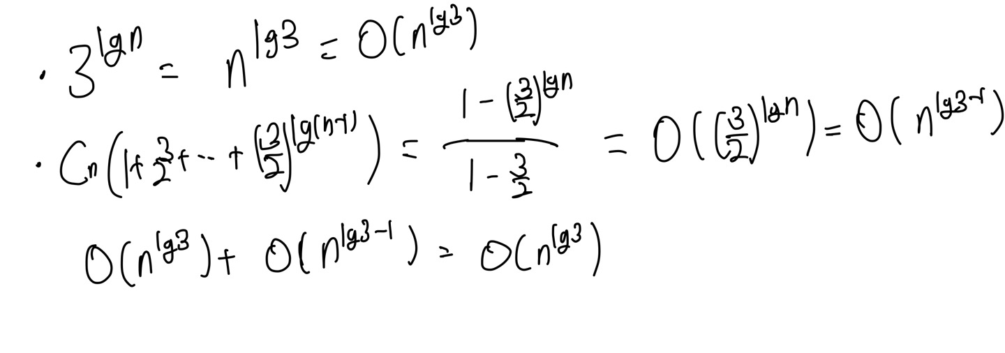 위의 1,2,3번을 고려하면 된다. 각 수를 n/2자릿수로 분할하는 과정과 곱한 숫자를 합치는 과정은 linear time이고 3번의 n/2자릿수 곱셈은 3*T(n/2)이 걸린다. 즉 T(n) <= 3T(n/2) + Cn이다. linear time에 C라는 상수가 붙은 것은 알고리즘 구현 방식 등에 의해 달라지기 때문이다. 그럼, T(n/2) 에서 T(n/4)로 진행될 때는, T(n/2) <= 9T(n/4) + C(n+ 3*(1/2)n) 이다.