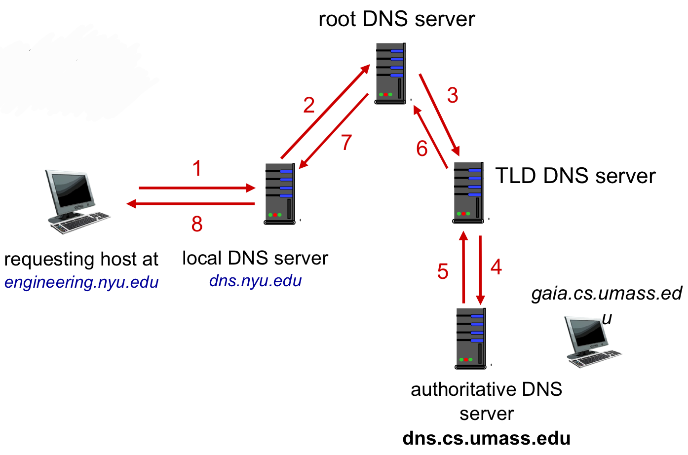- local DNS server는 다시 TLD DNS server에 engineering.nyu.edu에 대한 쿼리 요청을 보낸다