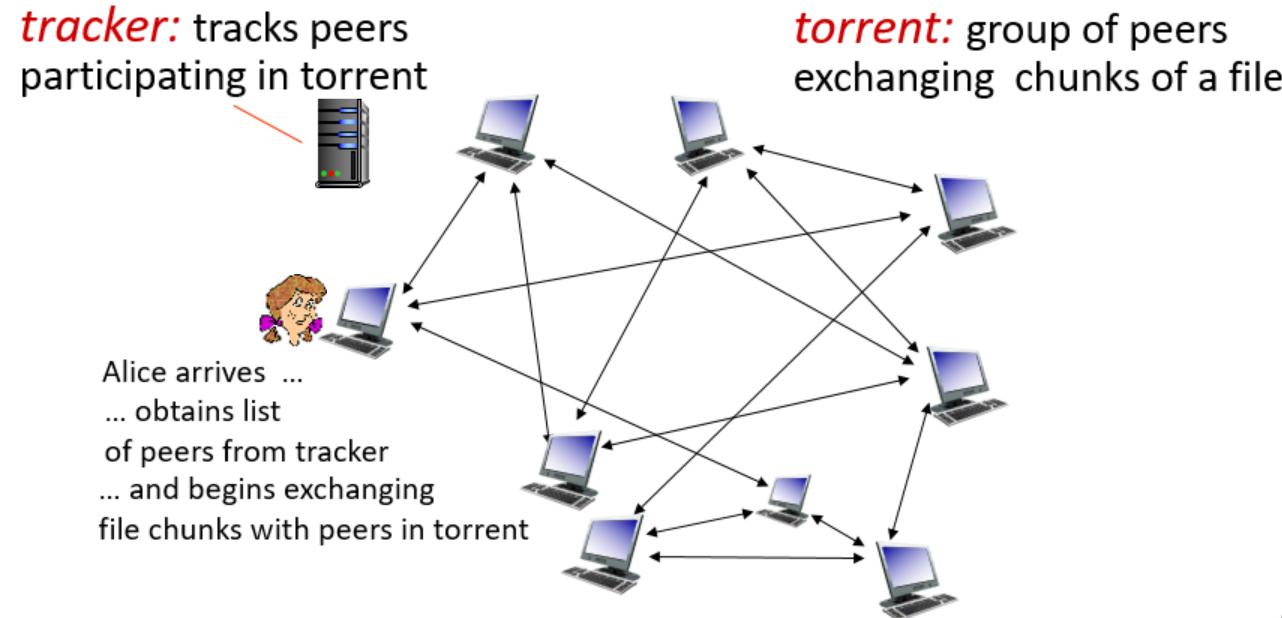 위에서 Alice가 이 network에 접근해서 영화를 다운받으려고 하고 있다. P2P 네트워크에 접근한다라는 것은 나의 peer를 찾는 일이다. 그렇지만, 여러 peer들이 존재하고, 어느 peer와 처음으로 연결할지 막막할 수도 있다. 이 때, tracker라는 존재가 peer를 찾는 일을 도와준다. 즉, 클라이언트 Alice는 tracker에 접근하면 peer를 알려준다는 것이다.