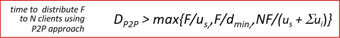 즉 client는 다운로드 받음과 동시에 업로드도 같이하게 되는데, 일단 기본적으로 서버가 F를 업로드 한 번을 하고 클라이언트가 다운로드 하는 시간은 clinet-server 패러다임과 같다.