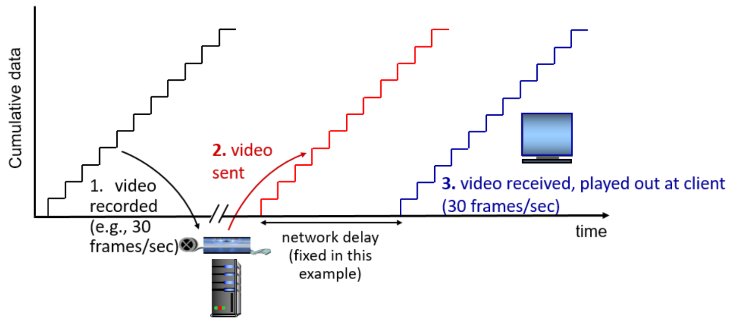 이 때, 2번과 3번 사이에 network로 인한 딜레이가 이 그림에서는 고정된 값이다. 즉, 이처럼 network delay가 고정이 되어 있으면, 클라이언트는 영상을 delay 없이 최적의 상태에서 시청할 수 있게 된다. 그 이유는 이미 보내져서 기다리고 있는 데이터가 클라이언트 버퍼에 있기 때문에 그 버퍼를 넘어서지 않는 한, 최적의 상태에서 시청하게 된다.