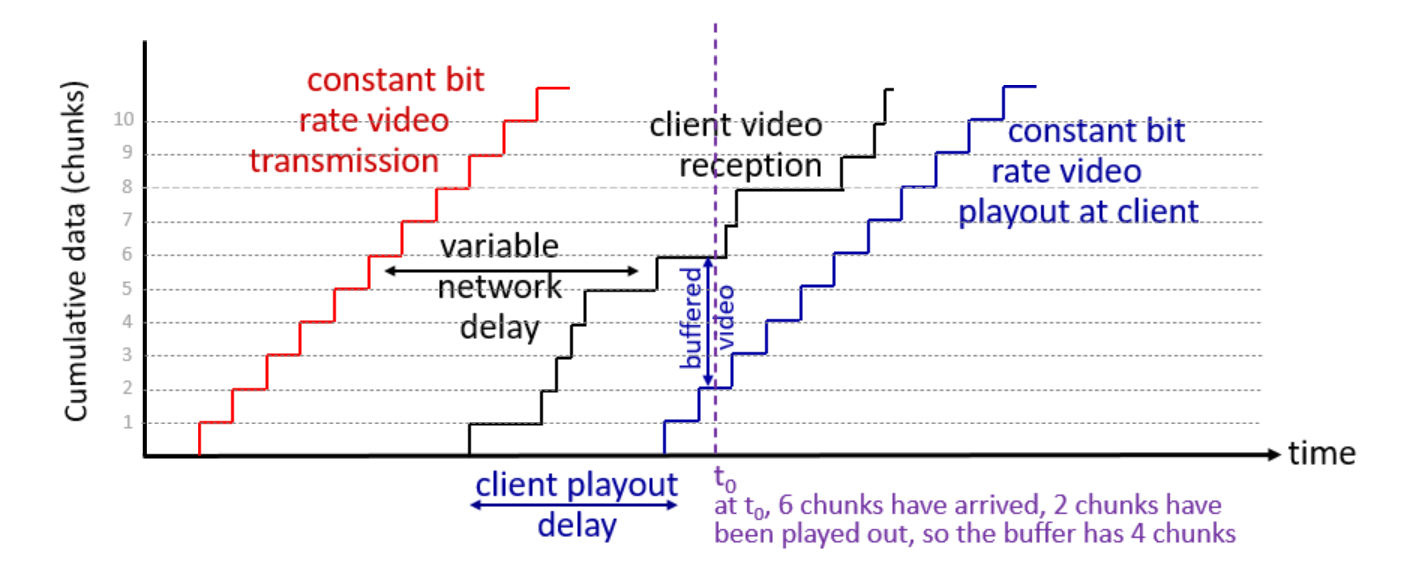 그렇지만, 클라이언트가 받는 비디오는 variable network delay 때문에 시간에 따라 다르다. 검은색으로 된 그래프를 보면, 어느 순간에는 일정 시간동안 들어오는 data가 유지되고, 어느 순간에 다시 받고를 반복한다. 즉, 일정한 계단식으로 상승하는게 아니라 왔다 갔다 하며 데이터를 받는다.