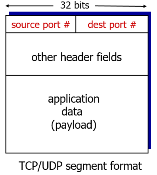 위, 그림은 TCP/UDP의 포맷으로, 4계층에 속하는 TCP/UDP의 포맷이다. 즉, host는 IP datagram을 받고, network 계층에서 IP address를 제거해 위 그림과 같은 형태로 transport 계층에 전달해 주는 것이다. transport 계층 전달받은 segment format의 port 번호를 확인해 알맞은 소캣을 통해 application 계층으로 전달한다.