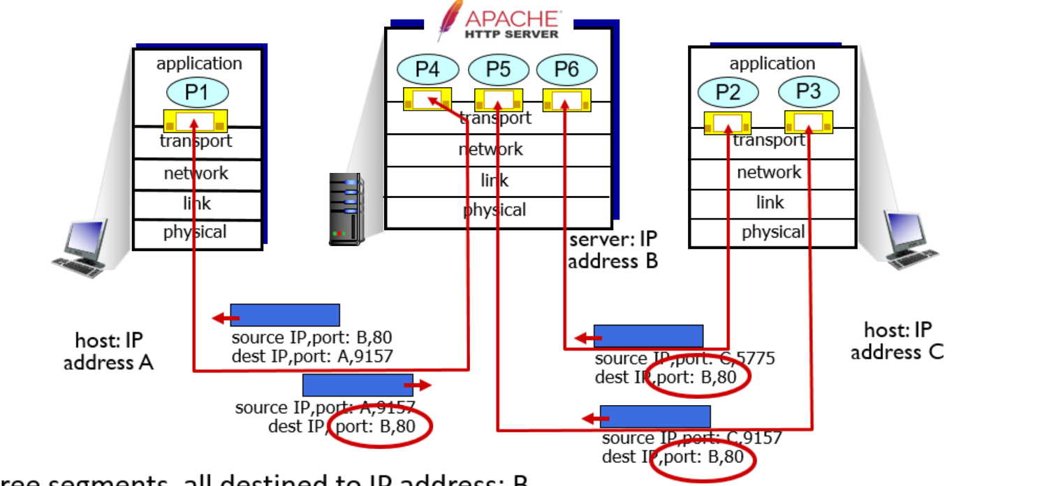 이 때, 각각의 socket 위의 4가지 식별자가 존재한다. 각각의 socket은 서로 다른 클라이언트와 연결돼 있다. 서버는 4가지 정보를 다 담은 segment를 보내고, 클라이언트는 받은 TCP segment format의 4가지 식별자들 다 확인한 후 알맞는 socket으로 전달한다. 클라이언트 측에서 일어나는 이 과정을 Demultiplexing이라고 한다.