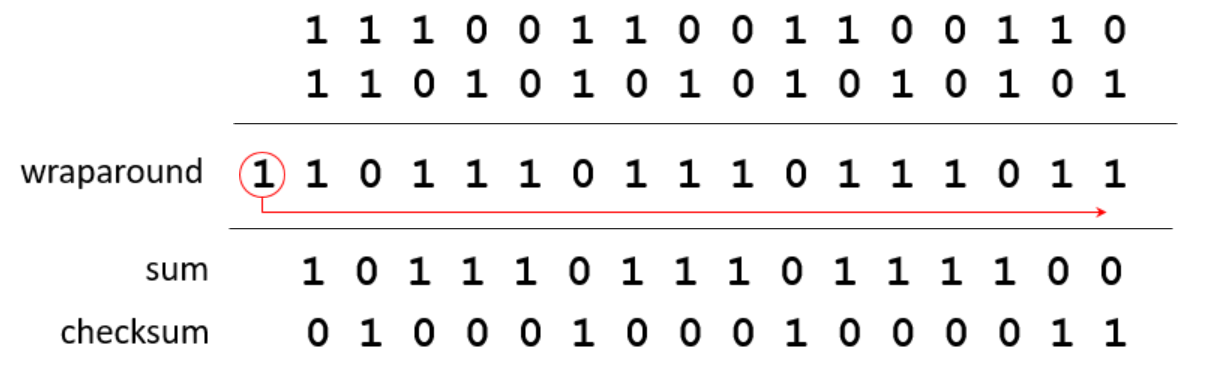 먼저 sender는 header를 포함한 모든 UDP segment를 16bit로 다 쪼갠 뒤, 모든 값을 더한다. 그리고 segment header의 checksum field에 이 값을 저장한다.