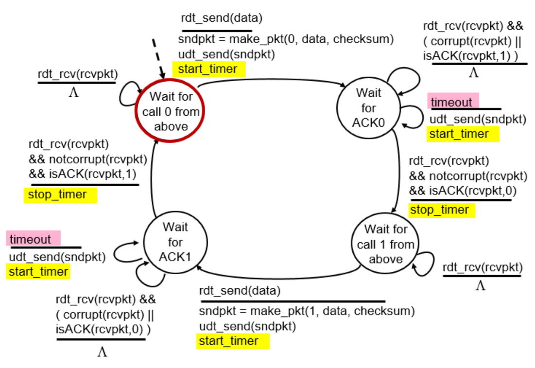 - 패킷에 sequence 번호 0번을 부텨 전송하고 이 전송되는 시점에 timer를 시작한다. 그리고 ACK 0번을 기다리는 상태로 간다.