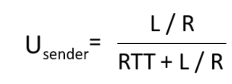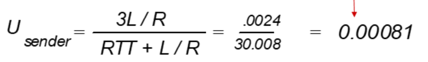 위 그림과 같이, 다음 패킷을 보낼 때, ACK까지 확인을 하고 보내야 되기 때문에, 다음 패킷을 보낼 때까지, RTT가 발생하게 되고, 다음 패킷을 보낼 때까지 걸리는 시간은 RTT+L/R이다. 즉 이를 위 숫자를 대입해서 계산해보면, 0.008+30 = 30.008이다. 이 때, Utilization은 다음과 같이 구할 수 있다.