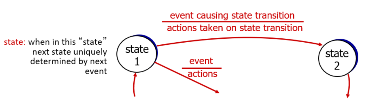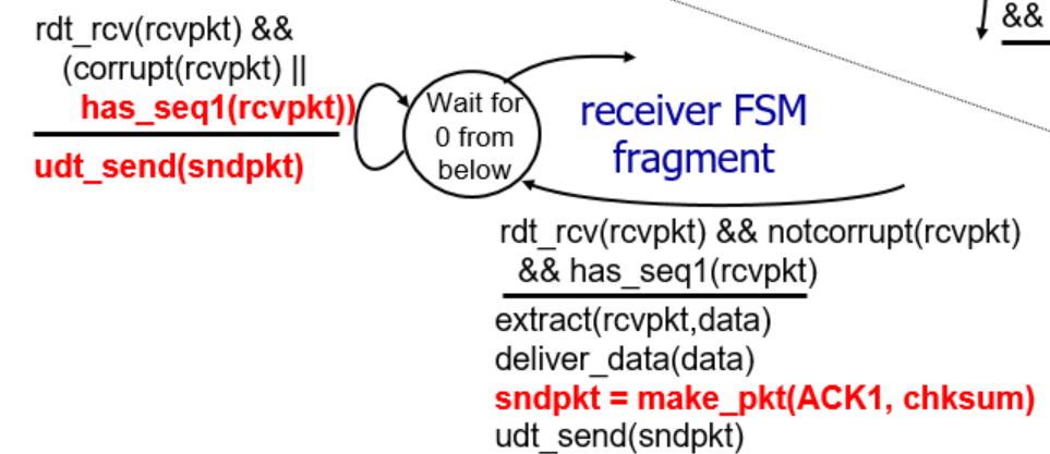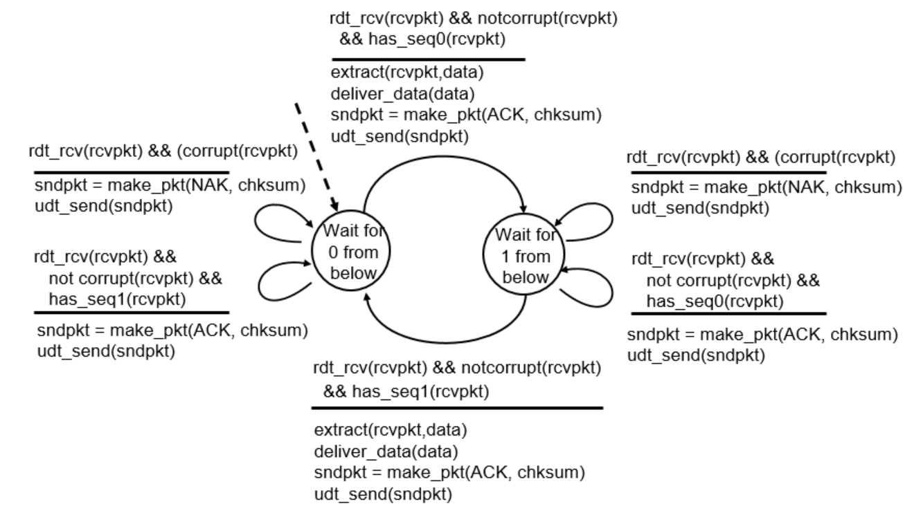 - 처음 상태는 하위계층(=network layer)에서 rdt_rcv()를 기다리고 있는 상태이다.