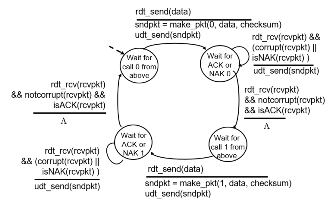 - 이 때, sender측에서 rdt_rcv(rcvpkt)&&isNAK(rcvpkt)이라면, udt_send(sndpkt)이 일어난다. 즉, 패킷을 받았는데(기대하고 있는 패킷은 ACK이나 NAK), 그 패킷이 NAK이라면, 전에 전송했던 패킷을 다시 보낸다.