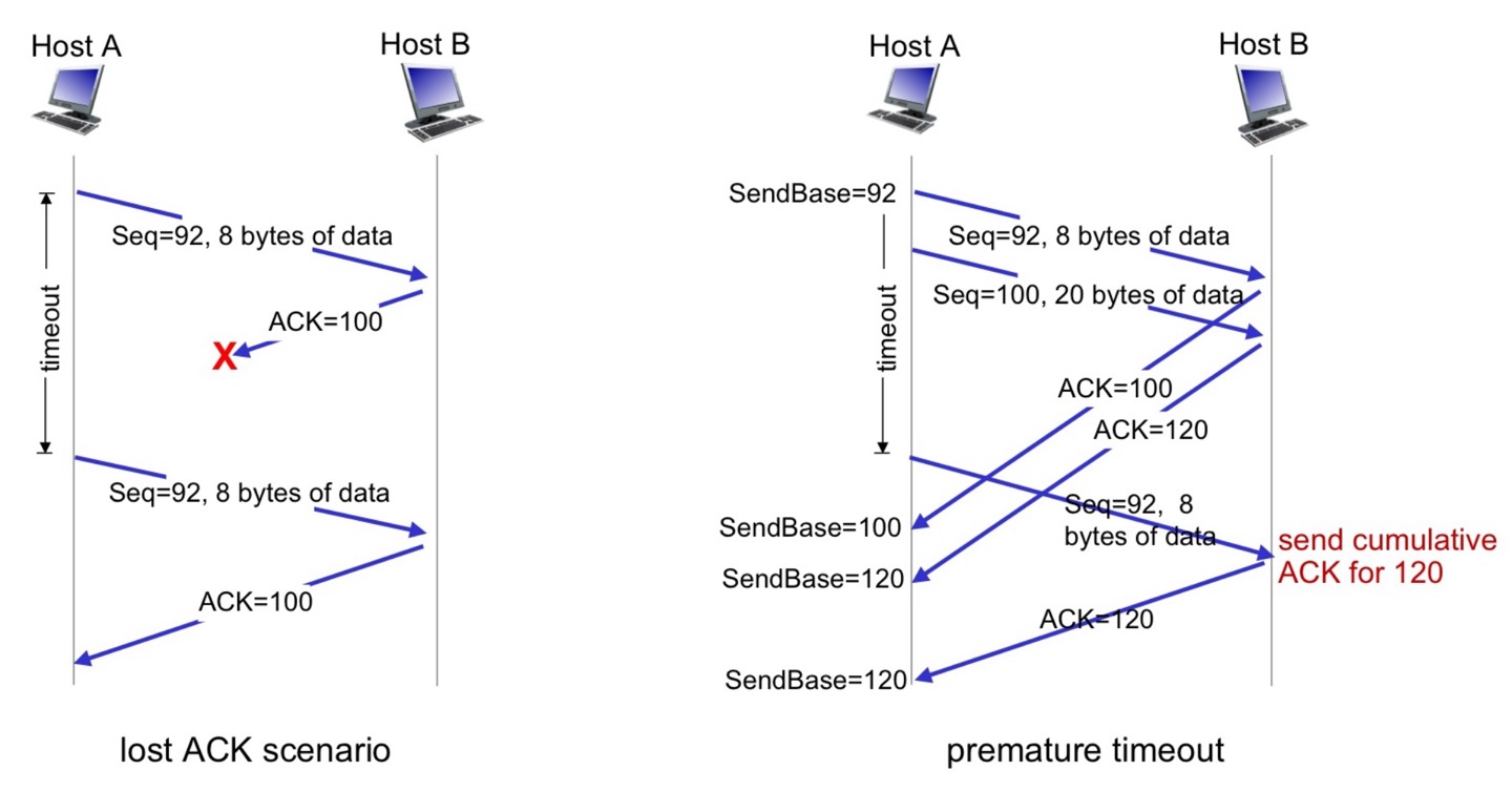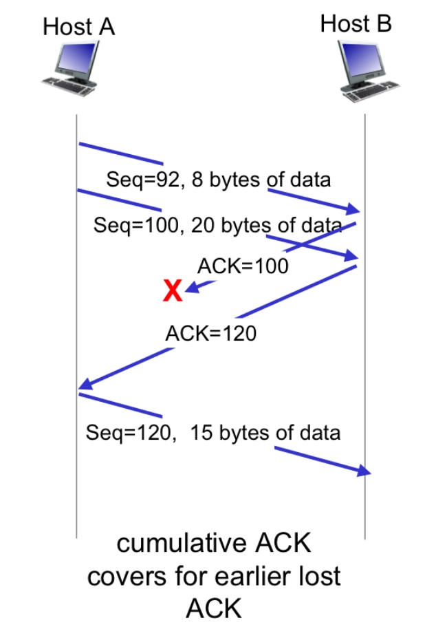 - 그 후, Host A는 ACK 100을 받지 못했지만 cumulative ACK를 통해 ACK 120을 받아 100도 잘 도착했다고 판단하고,