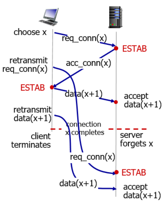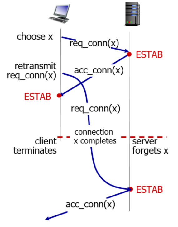 앞서, 2-way handshaking에서는 연결 요청 메세지가 연결이 종료된 후에 도착한다면, 2-way handshaking 방식에서는 server에서 반쪽짜리 연결을 하는 문제가 발생한다.