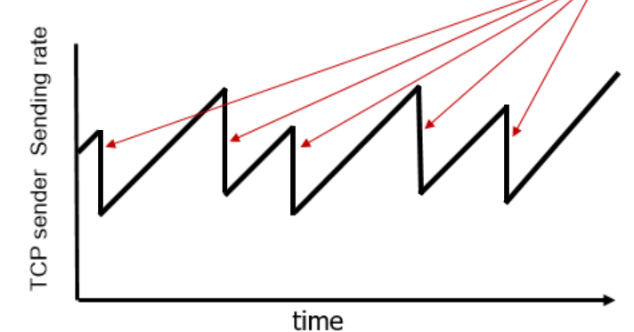 - sender는 packet loss가 발생하기 직전까지(congestion이 일어나기 전까지) 전송 속도를 올리고,