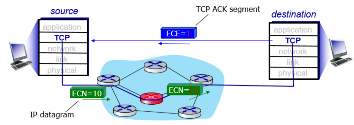 위와 같이 router를 이용해 혼잡도를 알리는 방식은 TCP의 확장인 TCP ECN에서 라우터가 ECN bit를 세팅하고 알리는 방법이다. 그렇지만, 이는 기본 TCP에는 포함되지 않는다.