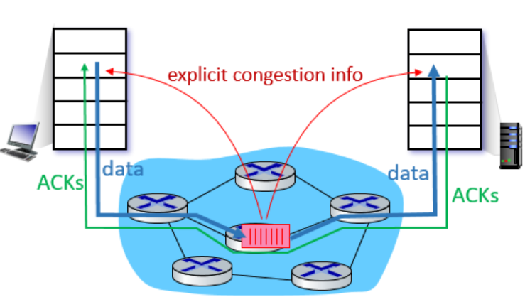 앞서 살펴본 TCP의 혼잡 제어 방식들은 모두 implicit 방식이다. 즉, TCP는 네트워크 상에서 혼잡이 어디에서 발생하는지 직접적으로 알 수 없고, 패킷 손실이나 RTT 증가와 같은 간접적인 정보를 바탕으로 혼잡을 추정하여 congestion control을 수행한다.