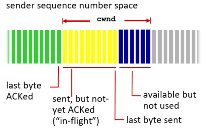 sender 측의 window를 나타낸 것이다. cwnd는 TCP sender가 네트워크에 보낼 수 있는 데이터의 최대 양(MSS 단위)을 나타내며, 다음과 같이 구성된다 .