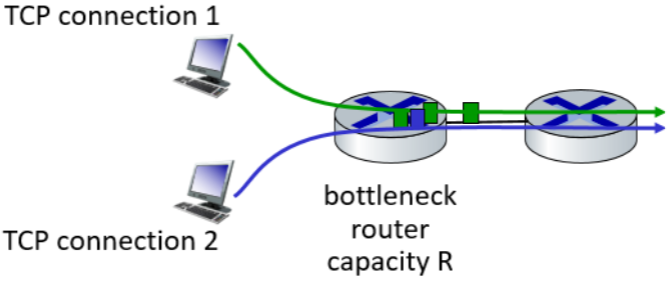 위 그림과 같이 2개의 TCP connection이 bandwidth가 R인 bottleneck router를 사용한다면, 각 연결은 R/2씩 사용해야 한다.