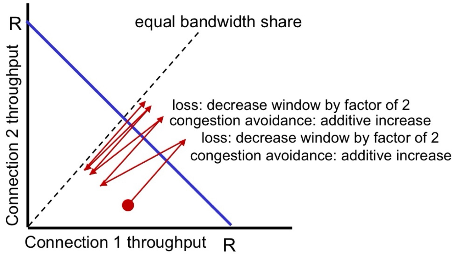 만약, K개의 TCP connection이 동일한 bottleneck link의 대역폭 R을 공평하게 나눠쓰려면 각 연결은 은 이론적으로 R/K을 사용하는 것이 이상적이다. 예를 들어,