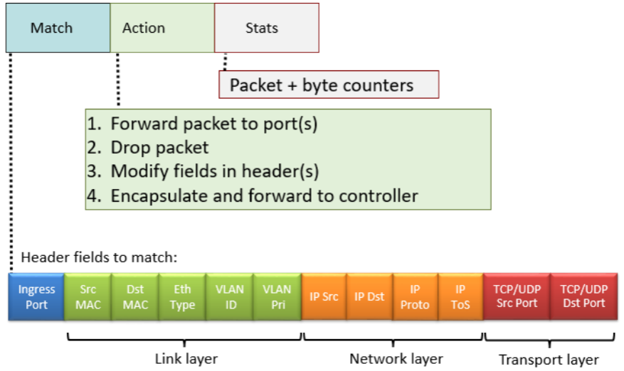 기존의 destination-based forwarding은 단순히 IP 주소가 match되면, forwarding하는 action을 취하는 방식이었다. 그렇지만, generalized forwarding은 match와 action을 조금더 확장해, match에 IP 주소 뿐아니라 여러 헤더의 field값을 조합하고, drop,forward,copy,modify 등 action을 다양화시킨 것이다.