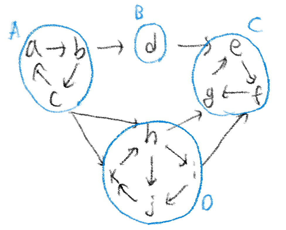 따라서 subgraph 간에 경로가 one-sided일 경우에만 서로 다른 SCC로 구분이 가능하게 된다. 따라서 G에 대해서 다음 그림이 성립하게 된다.