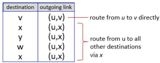 위의 least-cost-path tree를 바탕으로, forwarding table을 작성하게 되는데, 라우터 u에서는 다음과 같은 forwarding table이 나타난다.