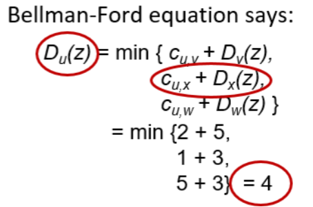 시작점은 u라고 가정하고, u의 이웃 노드인 x,v,w,이며, x,v,w는 목적지 z까지의 값을 안다고 가정하자. 이 그림에 대해 Bellman-Ford 방정식을 통해 Du(z)를 구하면 다음과 같이 나타낼 수 있다.
