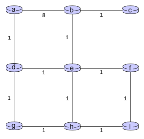 위 그림과 같이 a~i까지의 라우터와 연결된 각 link의 cost값이 주어져 있다고 가정해보자. 이때, b를 기준으로 예시를 들어보려고 한다.