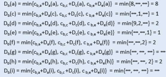 즉, a,c,e를 통해 갈 수 있는 노드들이 생기거나, 최단 경로 값이 갱신되면 b의 DV는 해당 결과를 반영한다. 따라서 위 계산을 진행한 결과, b는 다음과 같은 DV값들을 가지게 된다.