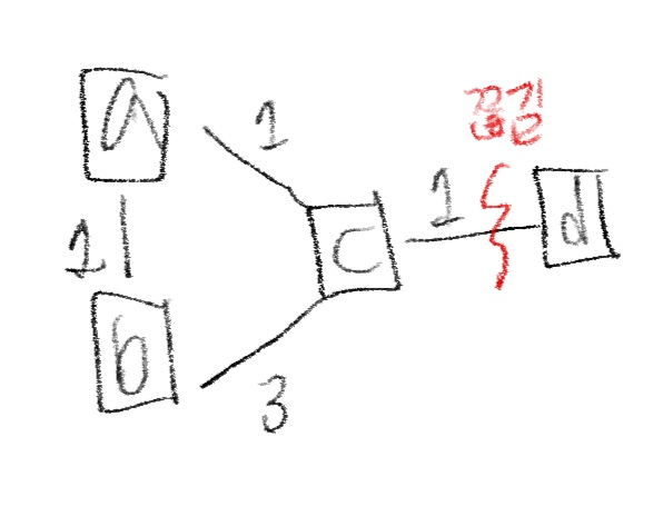 이때, 위 그림처럼, c-d 사이의 link가 끊긴 상황이라고 가정해보자. 이 상황에 다음과 같이 진행된다.