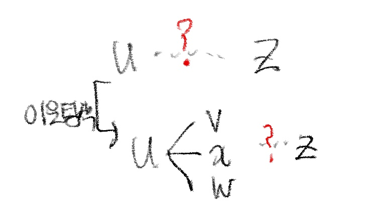 즉, u에서 z까지의 거리의 최솟값은 목적지까지 경로를 알고 있는 u의 이웃 노드들 중 최솟값을 구한 것이다. 즉, 이를 그림으로 나타내면 다음과 같이 표현할 수 있다.
