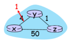 - 노드 x,y,z가 존재하고 초기 link cost는 x-y : 1, x-z : 50, y-z : 1이다.