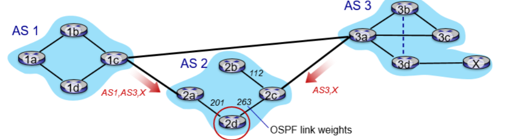 위 그림을 설명하면, AS2 내부에서는 OSPF를 통해 각 링크의 비용(link cost)이 계산되었고, 라우터 2d는 iBGP를 통해 2a와 2c를 거쳐 목적지 X에 도달할 수 있다는 경로 정보를 이미 알고 있는 상태이다.