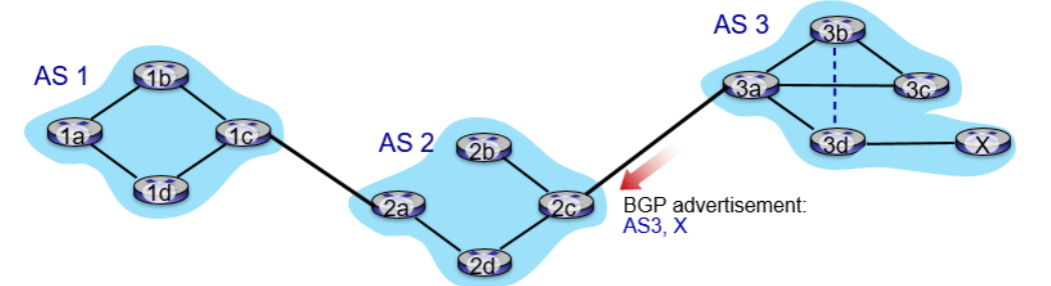 위 그림에 대해서 설명하면, AS 3 semi-permanet TCP를 통해 AS 3는 “내가 목적지 X에 도달할 수 있다”는 BGP 메세지를 AS2에게 전달한다. 즉, AS3는 AS2에게 "목적지 X로 가는 datagram이 나를 통해 전달될 수 있다"는 것을 약속한다.