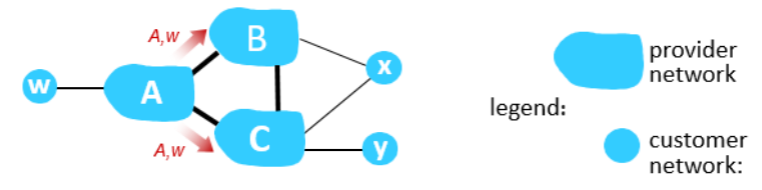 그림에 대해 설명하면, A,B,C는 ISP이고, w,x,y는 각각 연결된 ISP의 고객들이다.