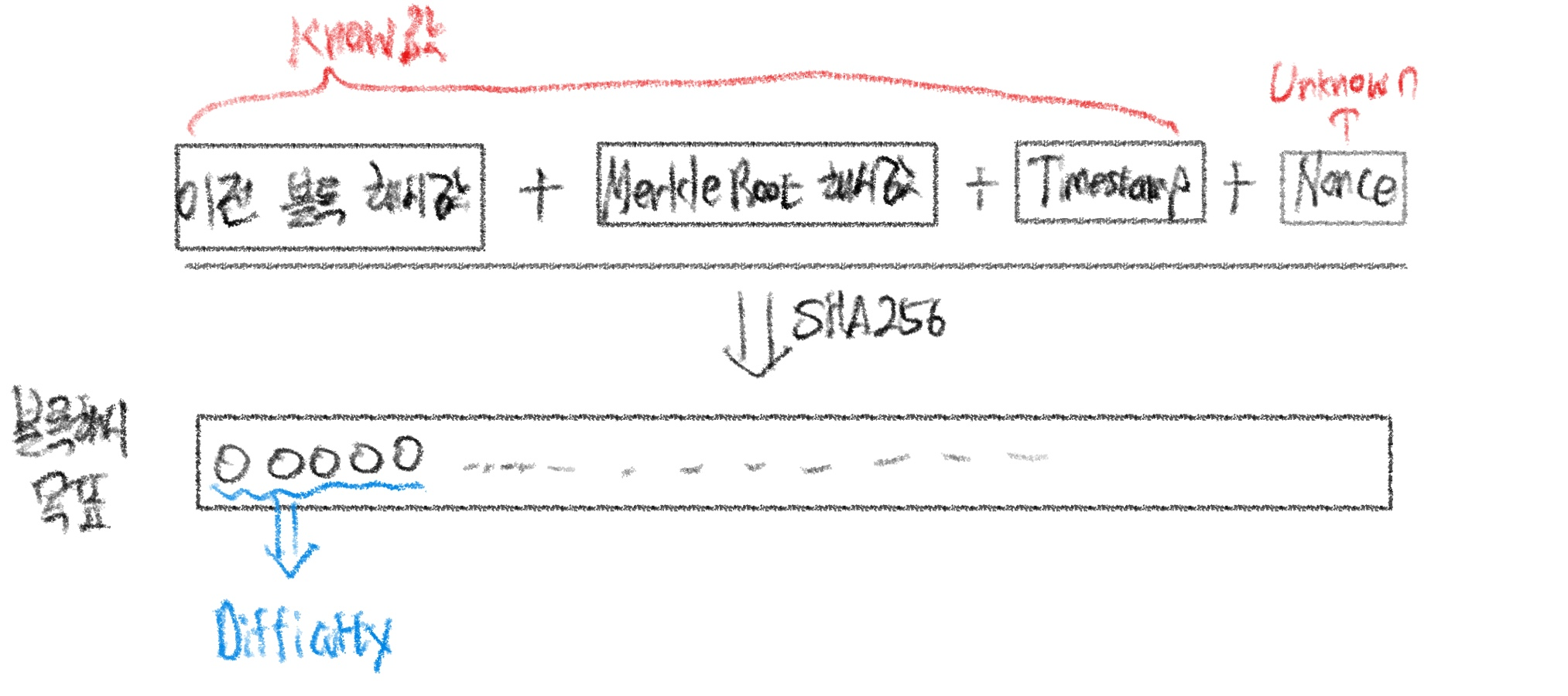 이때, 블록해시 목표값 앞에 있는 0의 개수는 Difficulty(난이도)이다. 즉, 해시 결과의 앞부분에 0이 많을수록 더 작은 값이 되어야 하므로, 채굴 난이도는 그만큼 높아진다. 반대로 앞의 0이 적을수록 조건을 만족하기 쉬워져 난이도가 낮다는 것을 의미한다.