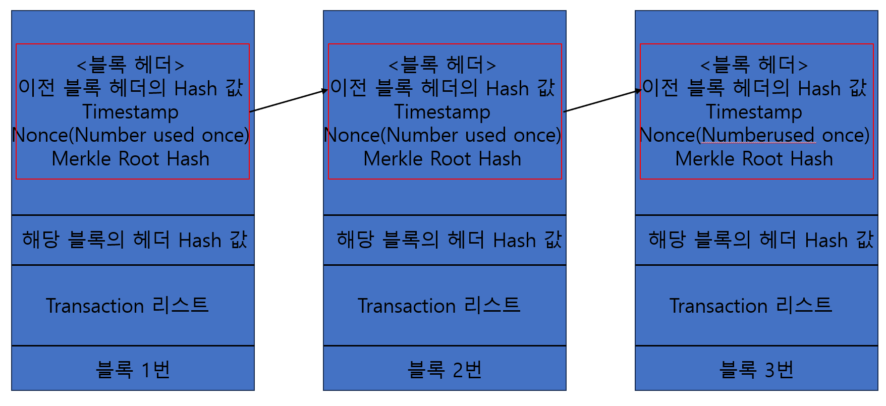 각 블록의 헤더는 이저 블록의 해시값을 포함한다. 즉, 블록 1의 헤더 해시값이 블록 2의 헤더에 포함되고, 블록 2의 헤더 해시값은 다시 블록 3의 헤더에 포함된다.