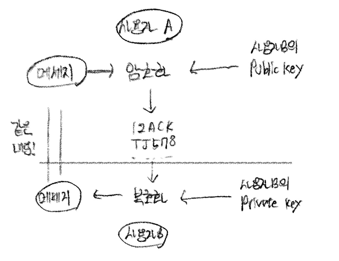 - 암호화한 메세지를 받은 사용자 B는 가지고 있던 Private Key로 해당 메세지를 복호화한다.