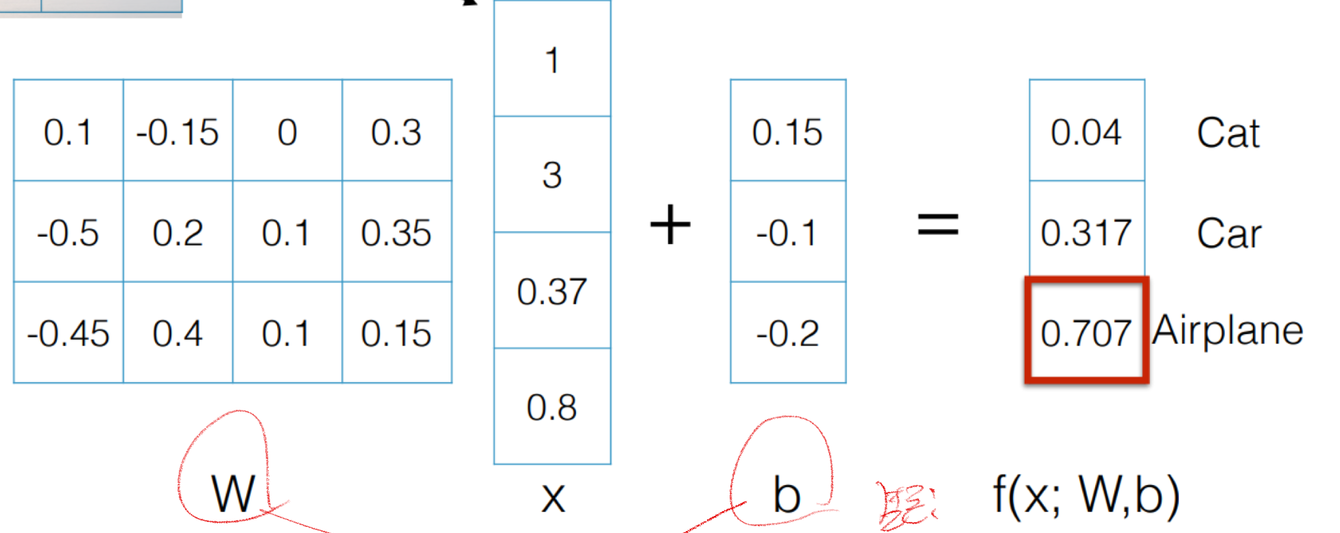 그렇지만, 만약에, W와 b를 각각 다른 값으로 진행한다면, 차는 고양이로, 비행기는 차로, 고양이는 비행기로처럼 이상하게 분류될 수 있다.