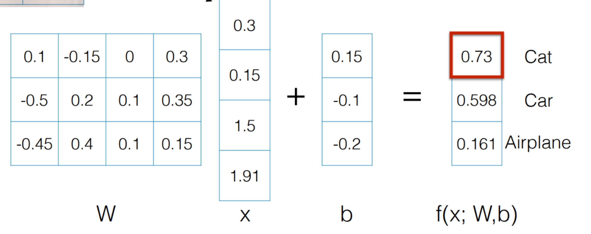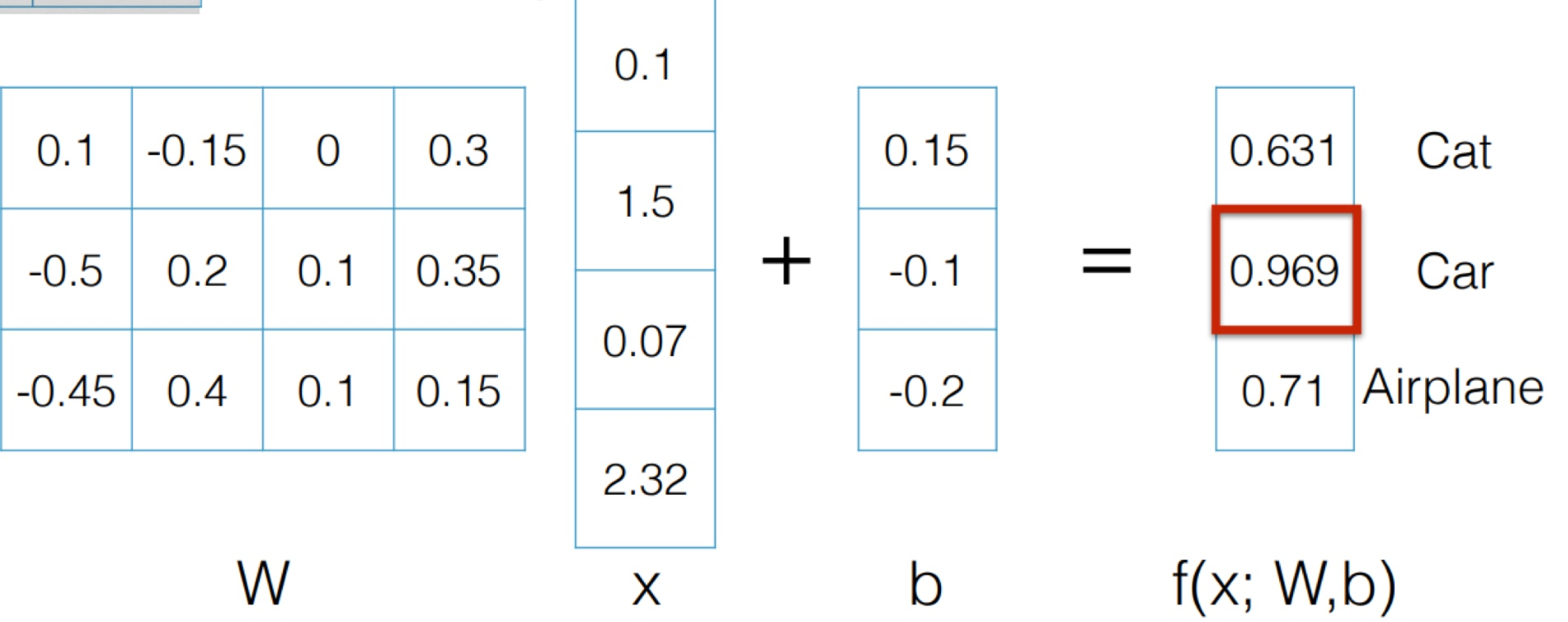 위 그림들을 f(x; W)를 통해 분류해 볼 것이다. 기대되는 값은 차 사진을 넣었을 때는 f(x; W)를 통해 차의 class가 나오도록, 고양이 사진을 넣었을 때는, 고양이가 나오도록, 비행기 사진을 넣었을 때는 비행기가 나오도록 하는 것이다. W와 b를 임의의 값으로 설정하고, 다음과 같이 x를 넣는다고 가정하자.