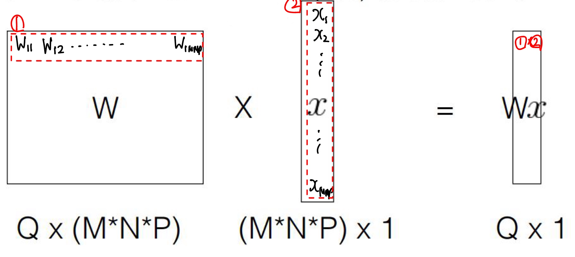 즉, 흔한 Linear 함수 Wx를 통해 Output을 결정하는 것인데, W는 Q x (M*N*P)의 벡터, x는 위에 나타낸 것처럼 이미지를 1차원으로 평탄화 시킨 벡터이다. 이 둘의 내적(= 행렬 곱)을 통해 Output을 계산한다. 이때, W는 학습이 이미 완료된 대상이다. 이때, Output의 하나의 벡터를 계산하기 위해서는 다음과 같은 내적을 진행해야한다.