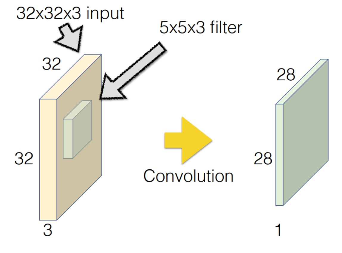 여기서 필터를 선택할 때는, 입력의 채널 수(3)과 동일해야 한다. 즉, RGB 이미지(3채널)에서는 필터의 채널도 3이어야 각 채널에 대한 정보를 동시에 반영할 수 있다. 이렇게 Convolution 계산을 진행해주면, 출력의 크기는 28*28*1이 된다.