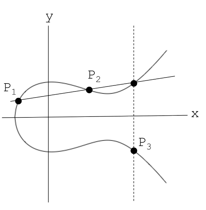 해당 그래프를 E: y^2 = x^3 - x + 1에 대한 그래프라고 하면, 독특한 점 연산을 정의할 수 있다. 예를 들어 위 그림과 같이 P1, P2가 있을 때, 다음과 같이 정의한다.