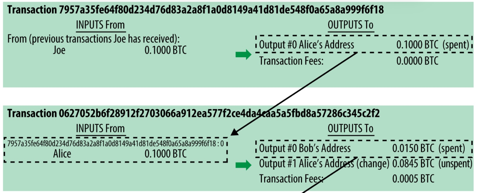 UTXO는 새로운 트랜잭션의 Input으로 사용될 때 전체 금액이 한 번에 소비된다. 즉, UTXO를 부분적으로 쪼개서 일부만 사용하는 것은 불가능 하다.