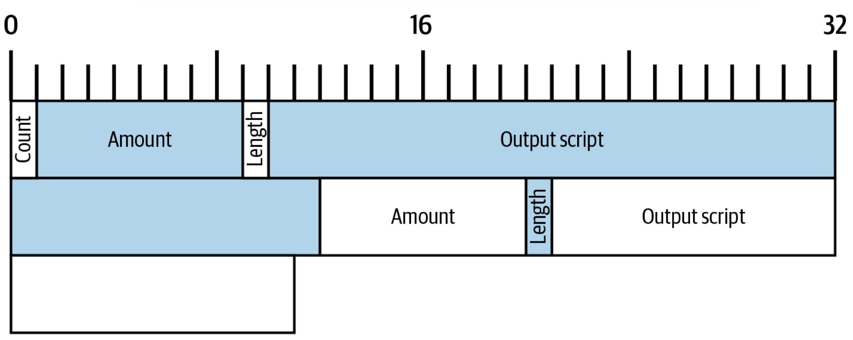 보통 위의 구조가 반복되어 여러 Output을 한 트랜잭션 포맷에 포함될 수 있게 한다. 즉, 파란색 부분 Amount ~ Output script까지 Output index #1, 그 다음에 흰색 부분 Amount ~ Output script까지가 Output index #2 로 사용된다.