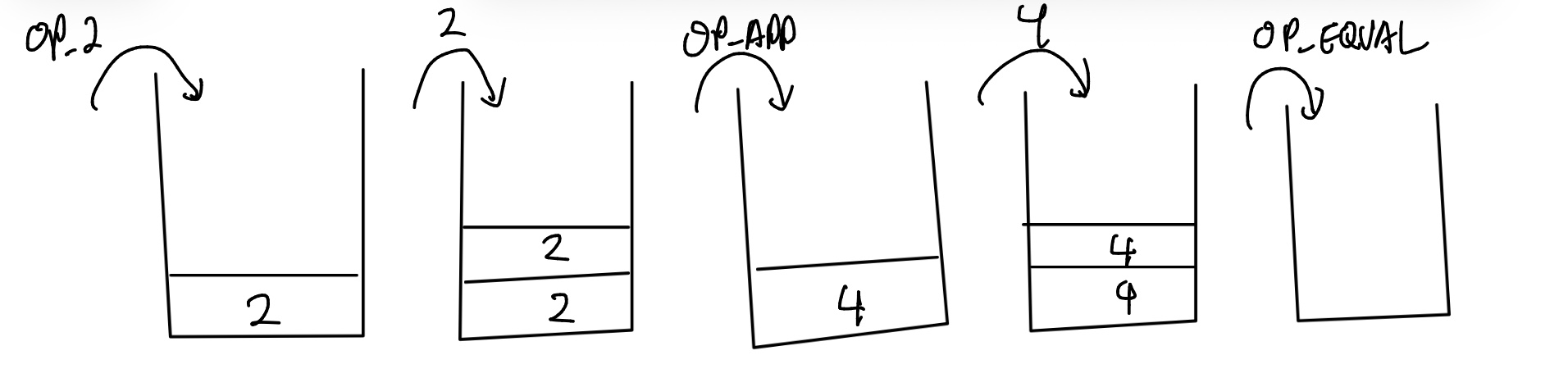 이때, 위의 두 Input은 서로 txid가 다르다. 둘은 다른 문자열이기 때문에, 해시값도 다르고, 서로 다른 Input이 된다. Input script와 Output script는 스택 베이스로 계산이 이루어지기 때문에 예를 들어 OP_2를 제시했다면 다음과 같이 진행된다.