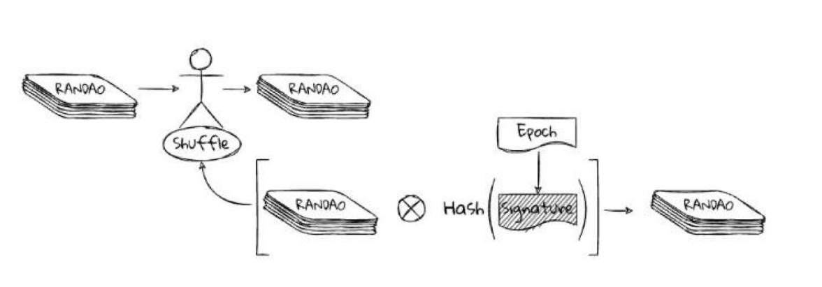 모든 참여자가 RANDAO를 확인할 수 있으며, 여러 validator가 순차적으로 난수 생성에 기여한다는 점에서 그림처럼 shuffle을 돌려가며 섞는 구조로 이해할 수 있다.